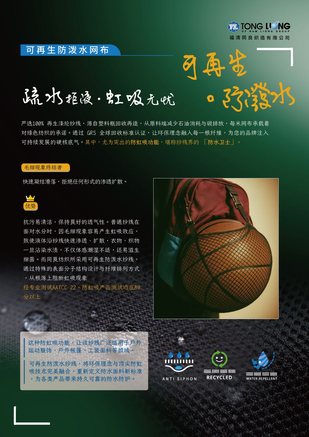 匯良推出的DT315-P 三明治网布,以简约且多功能的设计为特色,采用可回收防泼水纱线制成,将环保理念与顶尖防虹吸技术完美融合,重新定义防水布料的新标准,为各类产品提供持久且可靠的防水防护。