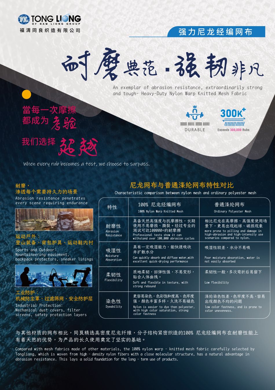 與其他材質的網布相比,同良精選高密度尼龍纖維,採用緊密分子結構編織而成的 100% 尼龍經編網布,在耐磨性能上具備天然優勢,為產品的長久使用奠定了堅實基礎。